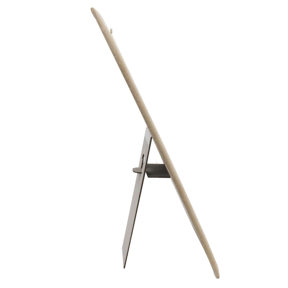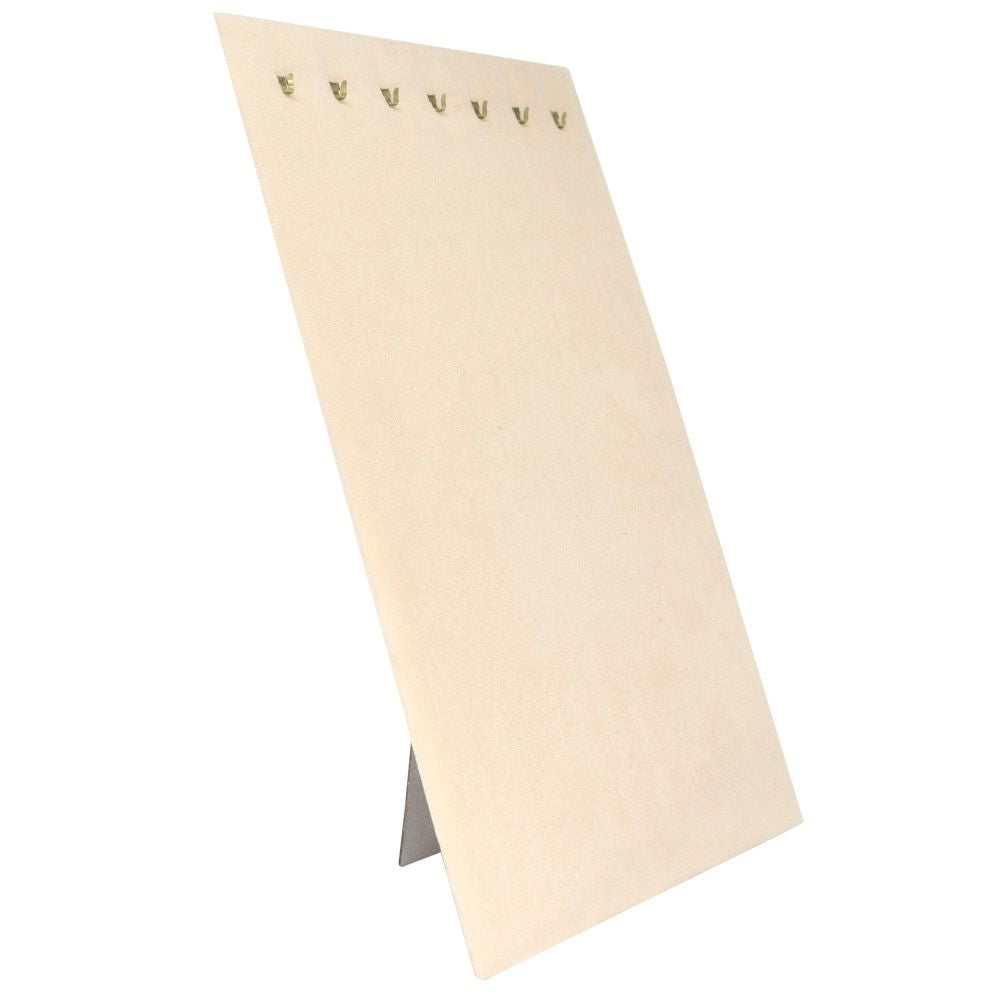 Description: The easel back to this display makes this chain board an ideal choice for a traveling display. There are (7) hooks at the top of this display that can be used for chains or necklaces. The neutral beige faux suede works well with a wide variety of colors and jewelry styles. Jewelry not included.