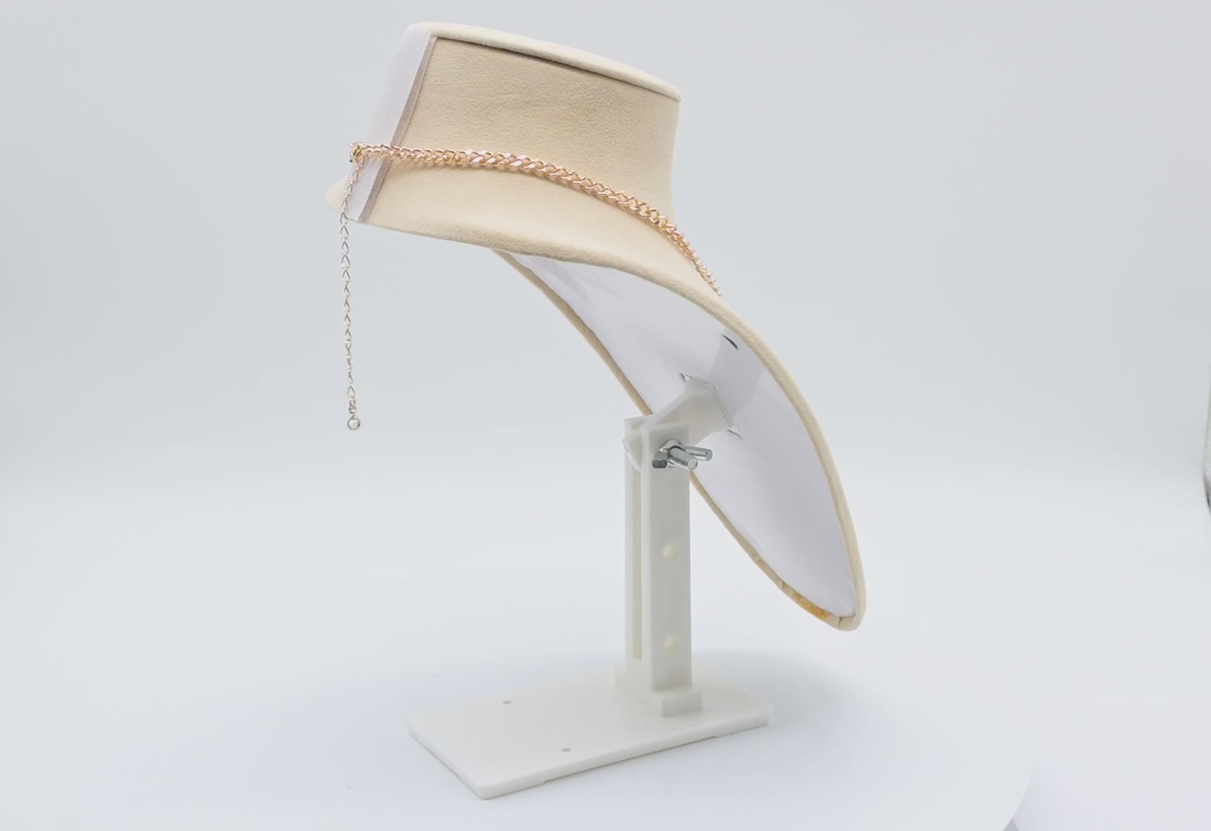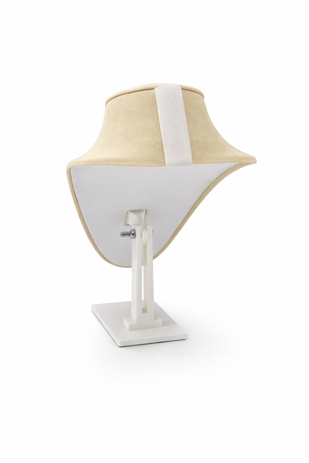 Display your necklaces with professional style using this versatile beige faux suede bust. Designed for jewelry vendors who need a lightweight, portable solution, this bust features an adjustable height base and secure velcro strap—perfect for craft shows, retail displays, or home use.