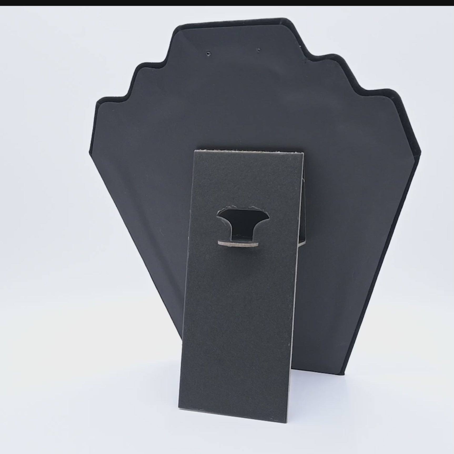 This black velvet easel transforms your jewelry presentation with a tiered structure that beautifully displays two necklaces at different heights—perfect for showing customers how pieces look layered together. The integrated earring holder at the top completes the coordinated display, ideal for boutique counters, trade shows, or retail showcases.
