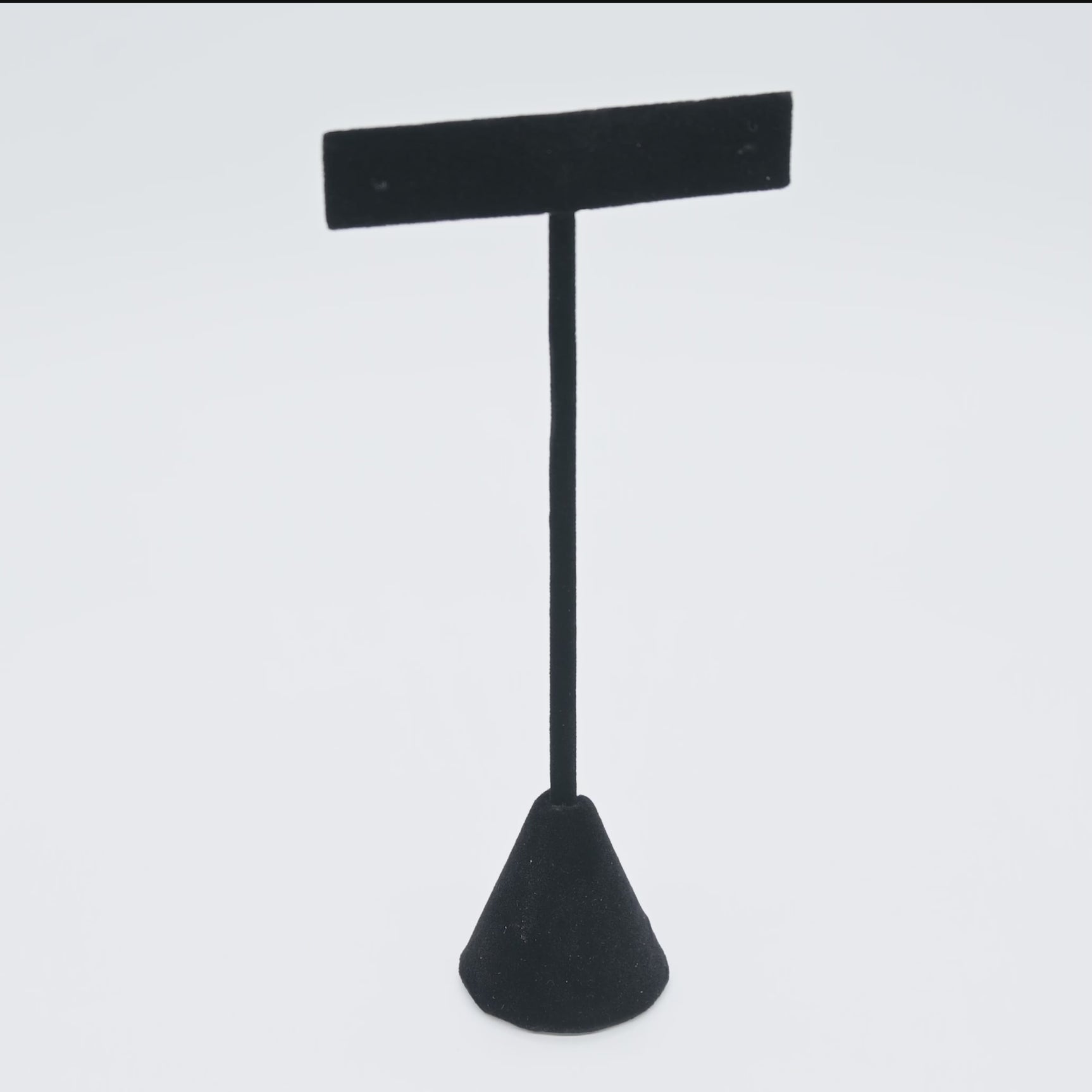 Create eye-catching earring displays with this tall black velvet T-stand designed to showcase a single pair of earrings at the perfect height. The weighted base ensures stable presentation while the luxurious velvet finish adds sophisticated elegance to your retail counter, jewelry case, or craft show booth.