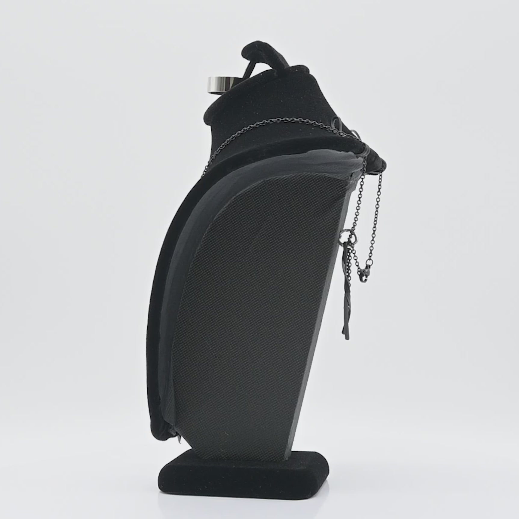 Item 189-3A BK is a black velvet necklace bust. This item is considered to be a combination bust because of a built in ring clip and a earring holder. This item works very well when displaying a set or collection of jewelry. Tiered Pricing: the more you purchase of combination necklace bust in black, the more you save.