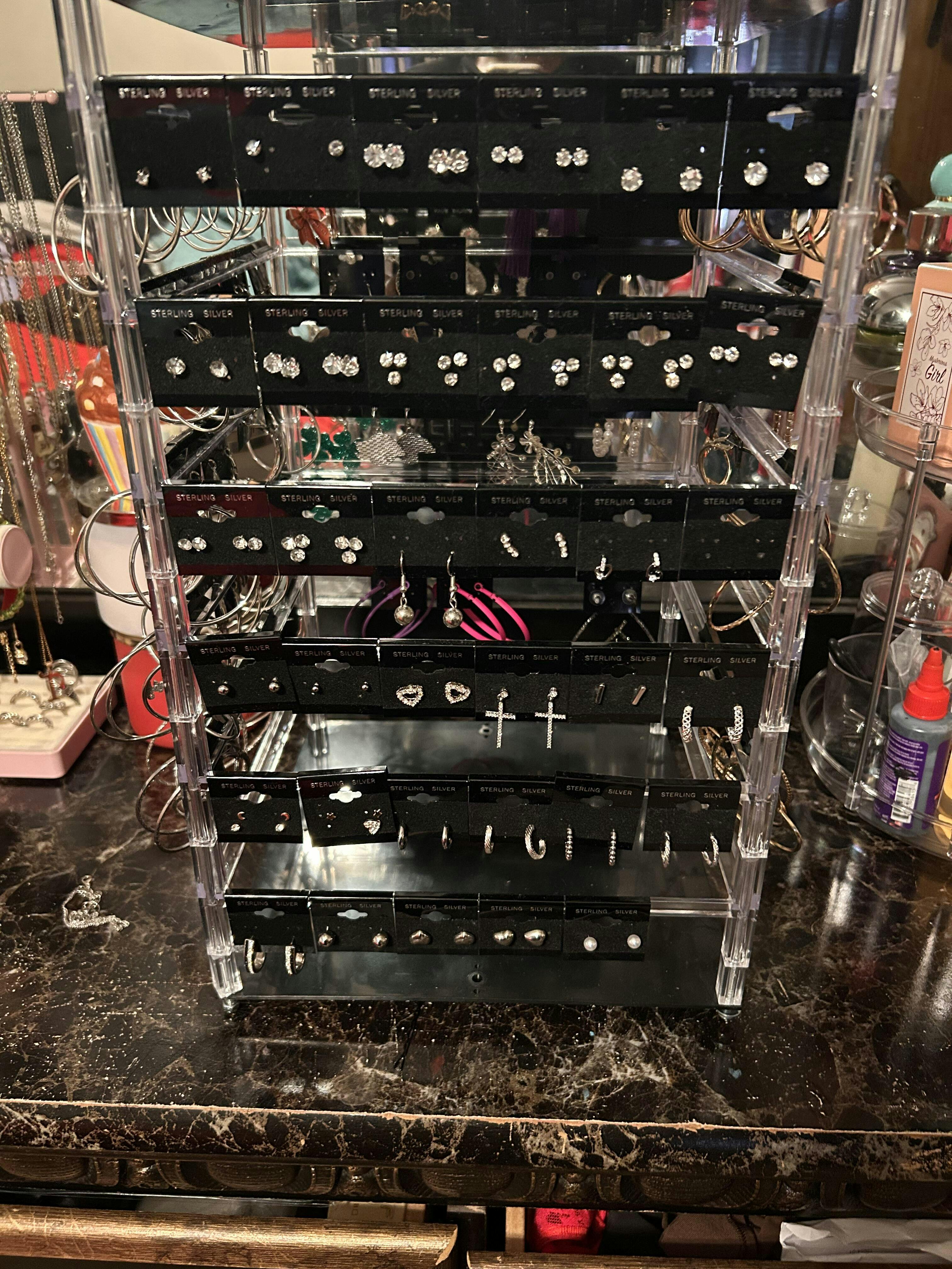 Description: This rectangular rotating earring display will accommodate any size earring card, but will hold 96 of the 2" cards. Hang cards on display with the tabs on the back of the cards. A great display for a jewelry counter! Earring cards sold separately and jewelry not included.
