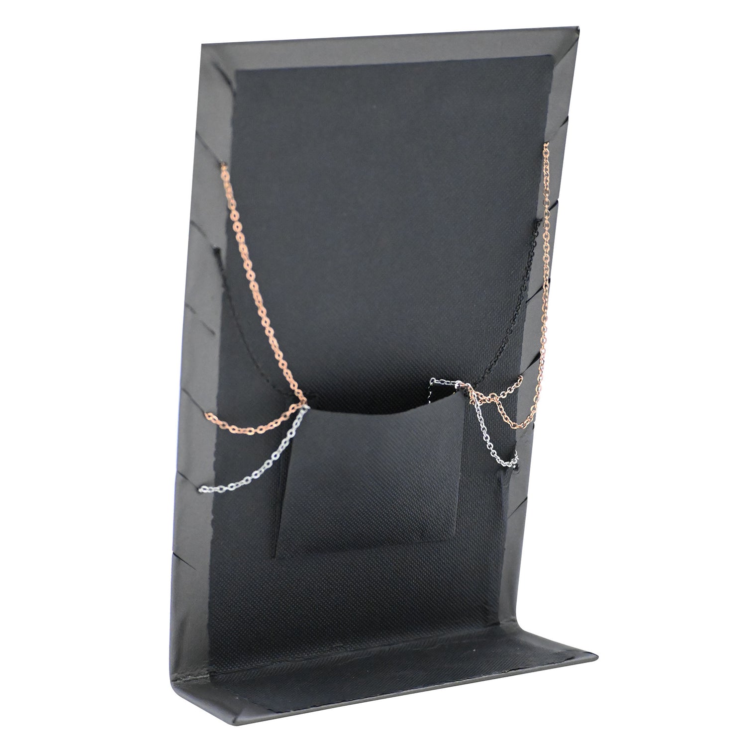 Elevate your jewelry presentation with this sleek steel-grey leatherette chain display — designed to hold up to six necklaces or pendants in an organized, professional layout. The soft-touch faux leather finish gives a refined and neutral background that highlights the shine and design of each piece. With convenient notches at the top and a rear pocket to hide excess chain, this display keeps necklaces untangled while creating a clean, minimalist look for your showcase or point-of-sale setup.