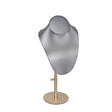Showcase necklaces with modern elegance using this steel grey leatherette necklace bust, designed to elevate fine jewelry and fashion pieces alike. The soft leatherette finish provides a refined backdrop that enhances metals and gemstones, while the gold metal adjustable base adds a touch of luxury and allows for customizable display height. Ideal for retail counters, showcases, trade shows, or photography.