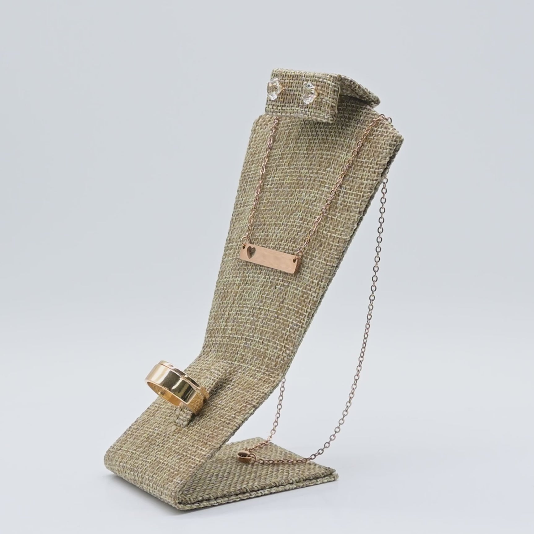 3-in-1 burlap jewelry display stand for earrings, rings, and necklaces. Durable spring steel construction, 5-1/2" tall. Perfect for showcasing matching sets.